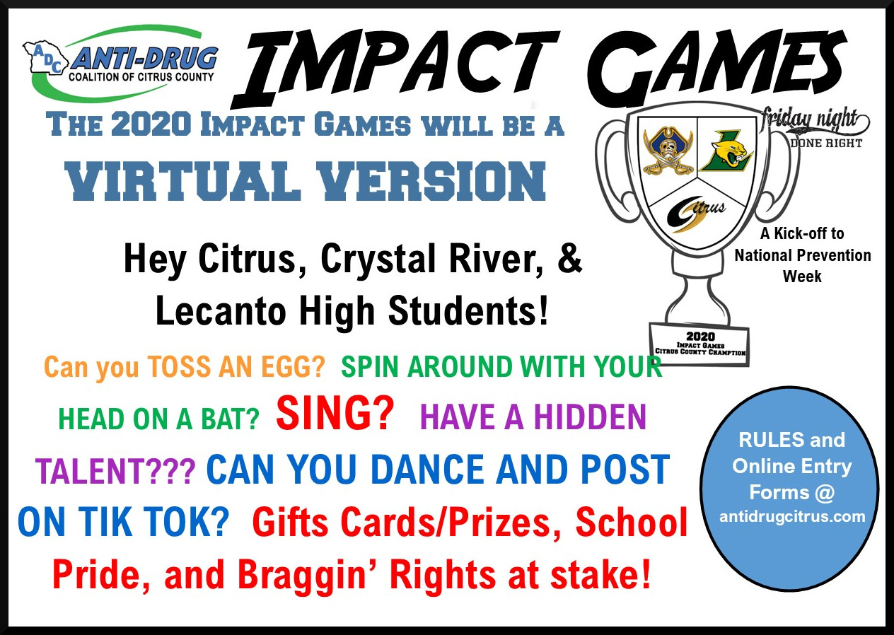 Welcome to the 2020 Impact Games. Below is a list of categories that students from Citrus, Crystal River, and Lecanto High Schools can compete in as a part of the IMPACT GAMES--"Battle of the High Schools." Citrus High was the winner of the first ever Impact Games held in May 2019. The Impact Games originated as an idea from local students and the Anti-Drug Coalition as a way to bring awareness to Substance Use and Mental Health among teens in Citrus County. The event will be promoted as a way to celebrate National Prevention Week which is May 10-16th. #preventionhappenshere #citrusimpactgames